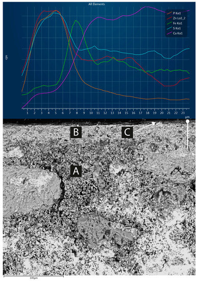 The SEM-EDS analysis revealed similar microstructural and compositional characteristics for samples SG9A and SG9B. The samples are layered, with an air lime-based arenaceous plaster (A) on which two paint layers (B, ca. 20 µm; C, ca. 8 µm) are visible (Figure 5). A detachment is observed between layers B and C. Layer B is more compact than C and both are air lime-based. The EDS microanalysis of the small areas of the painted layers reports the presence of iron oxyhydroxides in layer B, and calcium phosphate (bone black), zinc oxide, and iron oxyhydroxides as pigments in layer C. The compositional traverse in Figure 5 shows the gradual diffusion of phosphorus in the underlying layer, confirming the hypothesis of an “a fresco” painting. The correlation between K, Al, Si, and Fe in layer C might indicate the presence of red bolus [34]. S is due to the presence of gypsum.