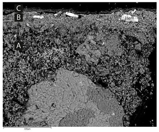 SG10, SEM-BSE image of the outer portion of the sample (plaster layer “A” and paint layers “B” and “C”). Light grey tabular fragments of hematite (Hem) occur as pigment in layer B.