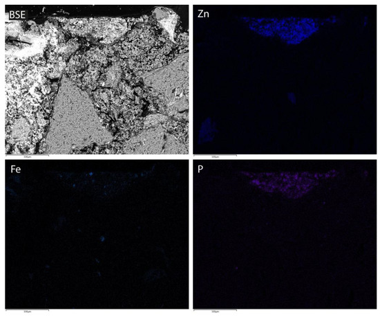 SG14, SEM-BSE image of the outer portion of the sample and related EDS maps of Zn, Fe, and P.