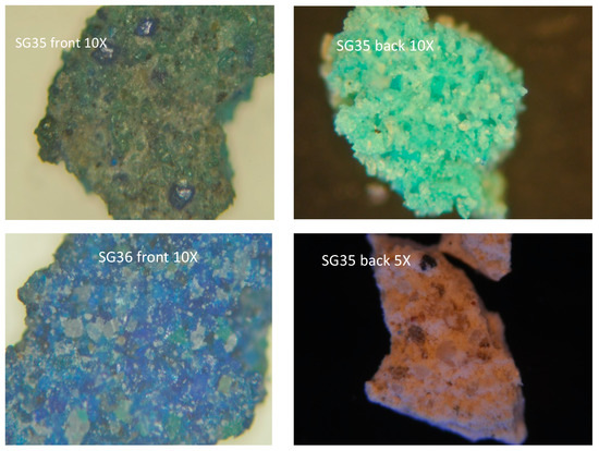 The SG35 front (Figure 9) is characterized by a layer with small blue grains on a yellow background giving a green hue. Some bigger blue grains can be spotted, which Raman identifies unambiguously as azurite. On the back, pale green crystals are present, which Raman identifies likely as a combination of brochantite (basic copper sulfate) and atacamite (basic copper chloride), which are likely alteration by-products from an original copper-based pigment. Two unidentified peaks at 444 and 1475 cm−1 suggest the presence of some other compound.