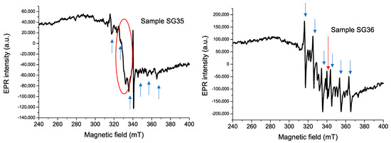 Left: EPR of SG35. Red asterisk marks the sharp signal of a C radical; blue arrows mark the sextet of Mn2+; the red circle highlights the signal of Cu2+. Right: EPR of SG36. Red arrow marks a C radical; blue arrows mark the sextet of Mn2+.