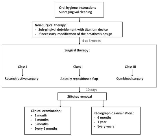 Once the diagnosis of peri-implantitis had been made, all patients received a de novo personalized oral hygiene instruction to change hygiene, and behavioural and professional prophylactic supragingival cleaning (Figure 1).