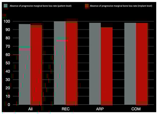 In the subgroup that underwent reconstructive surgical modalities, a 100% absence of progressive bone loss rate was achieved at both the implant level and patient level.