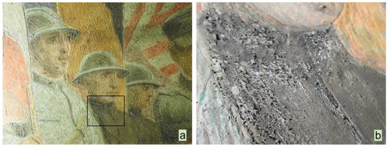 (a) Image of the east wall before restoration; (b) detail of the pervasive paint film exfoliation of the area highlighted in (a).