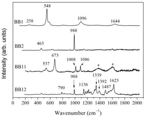Raman spectra of some compounds found on the painting samples. BB1—ultramarine blue; BB2—baryte; BB11—cerulean blue, gypsum, calcite, carbon (indicated by asterisk); BB12—Permanent Yellow 65, baryte.