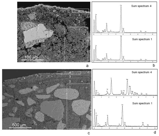 The samples, BB7 and BB8, from mortars were studied via microscopic examination of the cross sections (see Figure 3a,d). The elemental composition of samples was examined by SEM/EDS. It has been observed that the particle size of the inert has a diameter of about 125 µm to 1 mm, as is evident in Figure 3a,c. It can be defined as medium-coarse, sub rounded. The inert–binder ratio, also called thickening, is believed to be around 40–50%. The adhesion of the grain/binder does not seem very good, since cracks can be observed around the grains. About the composition of the inert, from the analyses by EDS (Figure 3b,d), carbonates and quartz can be observed. As for the chemical composition, the mortar would be compatible with a weakly hydraulic lime, but given that it crumbles easily, it is very likely that it is an aerial lime obtained from a calcium-carbonate-containing clay. With regard to the paint layer, thicknesses of about 10 µm were observed for the BB7 sample, (Figure 3b), the same thickness as the BB8 sample, with some grains containing barium (Figure 3d). The results are reported in Table 3.