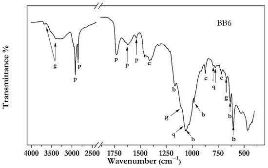 As a representative FTIR spectrum, the measurement recorded on sample BB6 is reported in Figure 4.