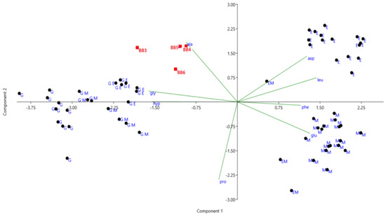 It should be noted that the first main component segregates the reference samples into two large groups: the first (points on the right side of the Cartesian graph) includes those associated with egg (E), milk (M), and egg–milk (EM) and is characterized by the amino acid composition of leucine, aspartic acid, glutamic acid, and phenylalanine; the second group (points on the left of the graph), associated with glue (G), glue–egg (GE), and glue–milk (GM), is distinguished by the composition of the reference samples of alanine, glycine, hydroxyproline, and proline. Moreover, in the first group, the second main component differs from the references (egg, upper box), characterized by the content in Asp and Leu, and the milk (lower box), typified by glutamic acid. In the second group, glue–egg (typed by glycine) is diversified—but to a lesser extent—all falling in the upper box, from glue–milk (with a less typical amino acid content); most of them fall into the lower box.