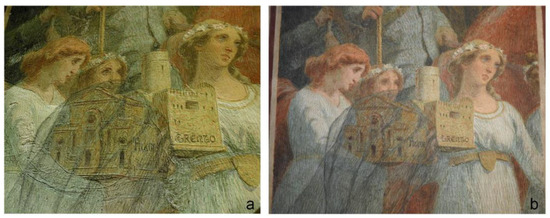 An interesting work by Izzo et al. [27] reports on the wall paintings of 1930 in Venice (Aula Magna of the Ca’ Foscari University) by Sironi (1885–1961), a famous painter of the first half of the 20th century, and it is focused on his pictorial technique. Most of the painting, in particular, the large monochromatic background, were executed according to the traditional “a fresco” technique. However, the morphology of the principal figures’ stratigraphy suggests the “a secco” technique, with egg yolk and traces of casein and arabic gum as binder for pigments based on zinc, titanium, chromium, and iron.