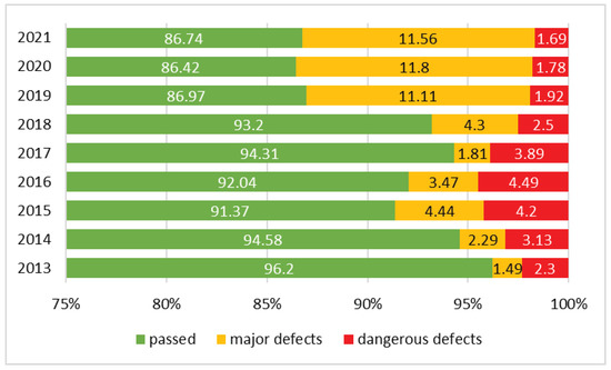 This paper did not aim to investigate the reasons behind these fraudulent practices or whether the regulations are excessively stringent. However, it is crucial to note that malfunctioning service brakes can result in highly hazardous situations on the road. Consequently, measures to mitigate fraudulent behavior at PTI stations have been implemented in Slovakia. Since 2019, it has been mandatory for all vehicle inspection stations in the Slovak Republic to install surveillance cameras as a preventive measure. The heightened monitoring has resulted in a higher failure rate during PTI inspections, which increased from 6.2% to 13.1% in March 2019, more than doubling the failure rate; the trend in failure rate from 2013 to 2021 is shown in