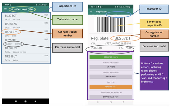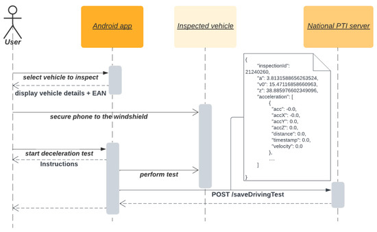 Figure 10. After selecting the vehicle designated for inspection, the inspector can press the “driving brake test” button. At this moment, the mobile phone should be securely mounted in a stand. Subsequently, the inspector can initiate the test during which they follow the instructions displayed on the mobile device. After completing the drive, the measured data are evaluated directly on the mobile device and the results are displayed on the device’s screen. After confirming the test results, the test evaluation, along with the measured data, are sent to the national PTI server.