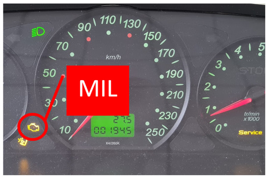 Figure 7, displays the malfunction indicator lamp activated. When encountering such a defect, it should be documented using the miscellaneous photo button to upload a photograph along with a brief description of the issue to the server. It is important to note that this type of defect typically appears on the diagnostic trouble codes list, and the presence of the MIL can be detected by reading the OBD as well.