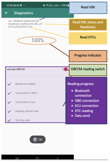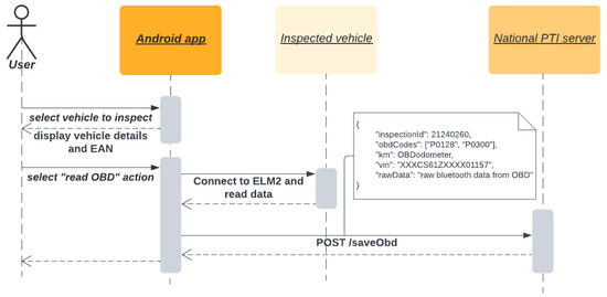 46]. The primary objective was to retrieve diagnostic trouble codes (DTCs) available via the open OBD service. Numerous smartphone applications are available that can read Diagnostic Trouble Codes (DTCs) using an ELM327 On-Board Diagnostic (OBD) reader. However, this particular application incorporates further PTI responsibilities and procedures, with an emphasis on preventing fraud by obtaining the following data:
