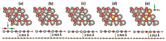 Figure 1 shows the optimized geometrical configurations of the 2D ZnO/graphene heterostructure predicted by DFT, highlighting the effect of defects (oxygen vacancies and substitutional FeZn atoms) on the 2D ZnO morphology and interlayer distance. The equilibrium distance between the pristine ZnO monolayer and graphene was estimated to be 2.931 Å, which was smaller than the same parameter reported by other authors (DFT-D2+U: 3.134 Å [38], GGA(PBE)-D2: 3.556 Å [13]). The fact that the structural parameters and electronic properties of 2D materials are usually method- and functional-dependent mainly explains this difference. However, a unique stacking configuration of a bilayer heterostructure modeled within this work could not be ruled out as a possible factor influencing the interlayer interaction. It was also observed that, independently on the defect type, 2D ZnO layers lay flat on the graphene surface. Table S2 (Supplementary Material) summarizes the z-coordinates of graphene carbon atoms in the considered systems. The observed similarity in the coordinates of carbon atoms in all models suggests that the local structure of graphene was hardly affected by the surrounding environment, including the presence of defects and doping in ZnO. When separately considering vacancy-containing and Fe-doped systems, it was evident that the stronger interaction between defective 2D ZnO and graphene, compared to that between pristine 2D ZnO and graphene, was manifested by a shorter interlayer distance. The structures, including 2 oxygen vacancies and 2 FeZn substitutional atoms, were characterized by the smallest values of the interlayer distance: 2.913 Å and 2.912 Å, respectively. This was consistent with the calculations of the adhesion energy. More specifically, the adhesion energy of pristine 2D ZnO on the graphene surface was predicted to be −0.076 eV per atom. While for the systems with 2 oxygen vacancies and 2 FeZn substitutional atoms, Eadh achieved more negative values (Table 1), pointing out a stronger interaction between the 2D ZnO layer and graphene.