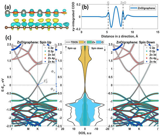 To comprehend the electronic properties of the 2D ZnO/graphene heterostructures, CDD analysis and band structure calculations were performed. As shown in Figure 2a, the charge accumulation (yellow-colored region) occurs mainly in the middle of the pristine 2D ZnO/graphene structure. This is also evidenced by an appearance of a strong CDD peak in the corresponding region of the xy-plane averaged charge redistribution curve presented in Figure 2b. In turn, the other two charge accumulation regions (as well as the maxima of the CDD curve) are located directly in 2D ZnO and graphene layers, while the charge depletion regions are manifested as deep minima of CDD curves were observed below (above) the 2D ZnO (graphene) layer. The nature of the charge redistribution in the system leads to the coincidence of the Dirac point energy with the Fermi level (Figure 2c). This was probably because the positive and negative charge carriers canceled each other out, making the graphene charge neutral. It is noteworthy that the band structure and density of states of the pristine 2D ZnO/graphene system were the same for the spin-up and spin-down channels. The conduction band mainly consisted of C 2p states, while the contribution from unoccupied Zn 4s states became evident above 2 eV. The valence band was mainly dominated by the occupied O 2p states; however, the contribution of occupied C 2p and Zn-related states was also significant.