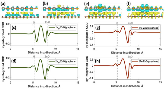 (a,b) Three-dimensional charge density difference plot and (c,d) x-y plane averaged charge density difference for 1VO-2DZnO/graphene and 2VO-2DZnO/graphene heterostructures, respectively. (e,f) Three-dimensional charge density difference plot and (g,h) x-y plane averaged charge density difference for 1Fe-2DZnO/graphene and 2Fe-2DZnO/graphene heterostructures.