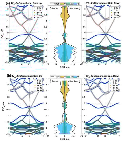 Atom- and orbital-projected band structures and PDOS of the spin-up and -down channels for the (a) 1VO-2DZnO/graphene and (b) 2VO-2DZnO/graphene heterostructures. The size of each circle corresponds proportionally to the orbital contribution of each band.