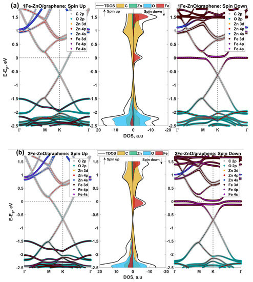 Similar to a pristine 2DZnO/graphene heterostructure, the nature of the band structure and PDOS for spin-up and -down channels for vacancy-containing complexes was basically the same. This contrast with the Fe-doped 2DZnO/graphene heterostructures, where the band structures exhibited strong spin polarizations (Figure 5a,b). More specifically, the Dirac point energy of graphene in spin-up and -down directions was approximately −0.619 and −0.643 eV for the 1Fe-2DZnO/graphene heterostructure and −0.663 and −0.691 eV for the 1Fe-2DZnO/graphene heterostructure. Another important observation was that Fe dopants were found to introduce additional states in the ZnO bandgap only in the spin-down direction. Remarkably, the Fe-related defect states were in the close vicinity to the Fermi level. This was probably the main reason for a strong charge transfer between Fe-doped 2D ZnO and graphene.