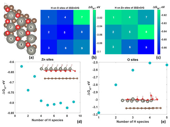 Panel (a) displays the oxygen- and zinc-adsorption sites for the 2D ZnO/graphene heterostructure and the sequence in which they become occupied by hydrogen species. Heatmaps of predicted Gibbs free energy of adsorption, ΔGH*, for the Volmer step on oxygen- (b) and zinc (c)-adsorption sites of 2DZnO/graphene. Dependence of hydrogen-adsorption energy on hydrogen coverage for (d) Zn and (e) O sites of 2DZnO/graphene. The insets demonstrate the optimized geometrical configurations of 2DZnO/graphene with maximum acceptable H coverage for both Zn and O sites.