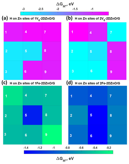 Heatmaps of predicted Gibbs free energy of adsorption, ΔGH*, for the Volmer step on zinc-adsorption sites of defect-engineered 2DZnO/graphene heterostructure: (a,b) oxygen vacancies and (c,d) Fe dopants, respectively.