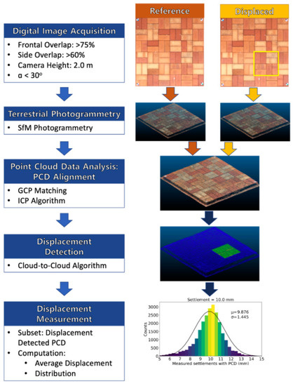 Figure 2 illustrates a flowchart of the proposed methodology. It shows the flow of the digital image acquisition method, PCD creation using digital images, and displacement detection and measurement through PCD comparison. The details of individual items in the flowchart are presented in the following sections.