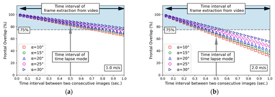 Frontal overlap depending on the time interval between two consecutive images with the moving speeds of (a) 1.0 m/s and (b) 2.0 m/s.