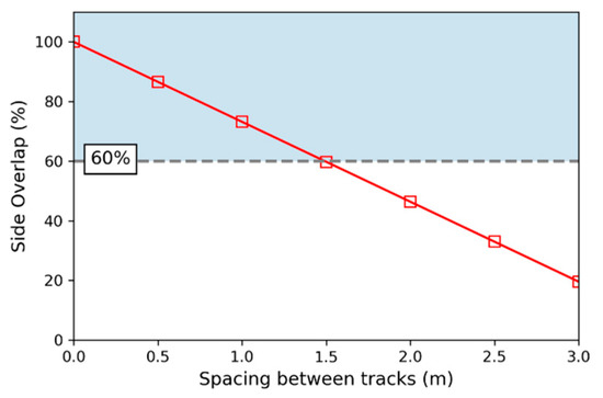 For a side overlap, the spacing between moving tracks is important to satisfy the requirement of at least 60% [37]. As shown in Figure 5, when the spacing was shorter than approximately 1.5 m, the required overlap was satisfied. Accordingly, the spacing was set shorter than 1.5 m when obtaining the images. Note that the camera was maintained at a constant shooting height of 2.0 m.