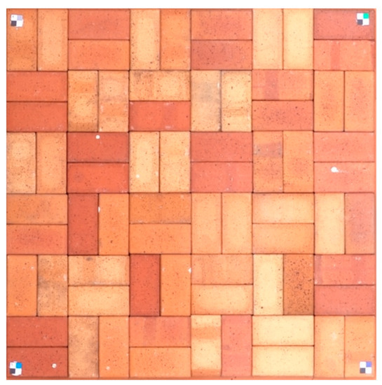 Figure 6 shows the reference without displacement setup to detect and measure the movements of the paving blocks measuring 1380 cm × 1380 cm. Seventy-two paving blocks with dimensions of 230 mm × 115 mm × 60 mm were used. The four corner markers were ground control points (GCPs), where the coordinates were measured using a global navigation satellite system rover, Trimble R10. These GCPs were utilized for the georeferencing of the PCD. By adding geographic information to the image, it is easy to detect and calculate changes in the PCD. The uplift and horizontal displacement of the paving block were induced by installing spacers in the reference paving block setup. Settlement was created by lowering the level of the floor where the paving block was placed.