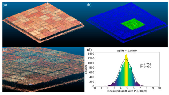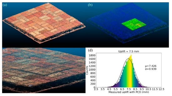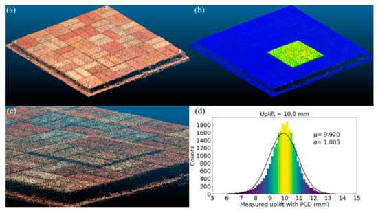 For the investigation of uplift cases, eight paving blocks were lifted by 5, 7.5, and 10 mm. As shown in Figure 7, Figure 8 and Figure 9, it was possible to detect every tested uplift case. Note that blue indicates no displacement and green indicates displacement. The number of subset points where displacements occurred was approximately between 25,000 and 30,000. As indicated in the subfigures (d) of Figure 7, Figure 8 and Figure 9, it can be seen that the distribution of displacements appears close to the normal distribution. When the accuracy was evaluated by subtracting the actual uplift value from the mean value (μ) measured by the PCD, the tested cases of 5, 7.5, and 10 mm were 0.241, 0.074, and 0.080 mm, respectively. Herein, the standard deviation (σ) of the PCD measurements was regarded as precision. The precisions for the tested cases of 5, 7.5, and 10 mm were 0.930, 0.939, and 1.003 mm, respectively.