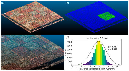 PCD of the 5.0 mm settlement: (a) PCD; (b) settled zone visualization; (c) zoomed in the 5.0 mm settled zone; (d) histogram of the settled zone.