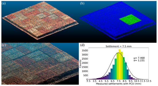 PCD of the 7.5 mm settlement: (a) PCD; (b) settled zone visualization; (c) zoomed in the 7.5 mm settled zone; (d) histogram of the settled zone.