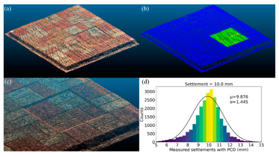 PCD with various displacements, PCDd, were compared with the reference PCD, PCDr. The open-source software CloudCompare version 2.12.4 was used for point cloud processing. Since identical GCPs were used for the creation of the PCD, the PCD were well aligned during the comparison. For better results, PCDd was slightly rotated and translated to fit PCDr using the iterative closest point (ICP) algorithm. Note that the ICP algorithm can minimize the difference between two PCD and is often used to construct a single PCD from different scans in several engineering fields. The displaced paving blocks were excluded while the ICP algorithm optimized the transformation matrix to determine the best fit, because the displaced paving blocks would influence matrix optimization. After obtaining the optimized transformation matrix, it was applied to the paving blocks with displacements. By conducting this process, it was possible to precisely align the PCD.