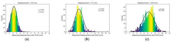 As shown in Figure 14, the histogram of each case was close to the normal distribution, but the histogram bars were jagged compared with the vertical cases. The mean values of the PCD measurements for the 5, 7.5, and 10 mm displacement cases were 2.260, 3.614, and 6.225 mm, respectively. Clearly, the differences between the actual displacement value and mean were large, and the counts were very small at the actual displacements. Although horizontal displacements can be detected, the measurement errors are significant.
