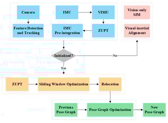 This paper analyzes the performance optimization of visual–inertial odometry based on a VINS system with the inclusion of the ZUPT on the VIMU data []. VINS belongs to the category of mature visual–inertial fusion algorithms, where the system estimates the pose information and constructs maps by fusing visual point clouds with pre-integrated information from inertial sensors.