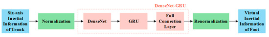 This method begins by classifying the inertial sensor information into gait phases using a DeepConvGRU neural network model. The DenseNet-GRU hybrid model is used to extract the nonlinear mapping relationship between the torso and foot inertial sensors, thereby constructing the VIMU. The pose information is estimated using the loosely coupled INS algorithm, and cumulative errors are corrected using the ZUPT algorithm. This method does not require the introduction of additional IMU hardware as a data source. Instead, data are still collected by a camera and a single IMU. The IMU data are mapped to the VIMU data using a deep learning model, which is then corrected for zero velocity to obtain a virtual inertial navigation sensor. After pre-integration processing, the VIMU data are used together with the pre-integration results of the camera and IMU for initialization.