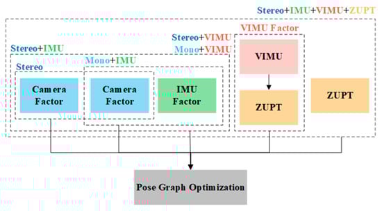 This article shows the adjustments made to the original state estimation framework of VINS, replacing the original IMU with a ZUPT-modified VIMU and incorporating ZUPT constraints. After adjustment, the framework still supports multiple sensor choices, such as stereo cameras, a monocular camera with a VIMU, and stereo cameras with a VIMU. Each sensor is treated as a general factor. Factors which share common state variables are summed together to build the optimization problem. The fusion of multi-sensor information factors is shown in Figure 7.