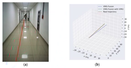 In Experiment 1, we conducted a benchmark straight-line motion experiment in an indoor environment. The hallway was chosen as the test environment due to its rectangular shape and simple scene with only one feature, which can be considered as a single-degree-of-freedom degenerate scene, as illustrated in Figure 8a.