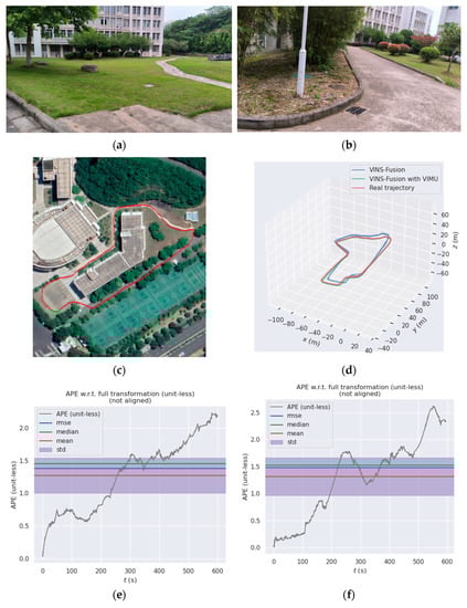 (a,b) Skewed image of Ground Conditions in Experiment 2. (c) Real scene of the outdoor experimental environment; (d) comparison of the localization performance between VINS-VIMU and VINS-Fusion, using GPS data collected simultaneously as the actual route benchmark; (e) localization performance of VINS-VIMU; (f) localization performance of VINS-Fusion.