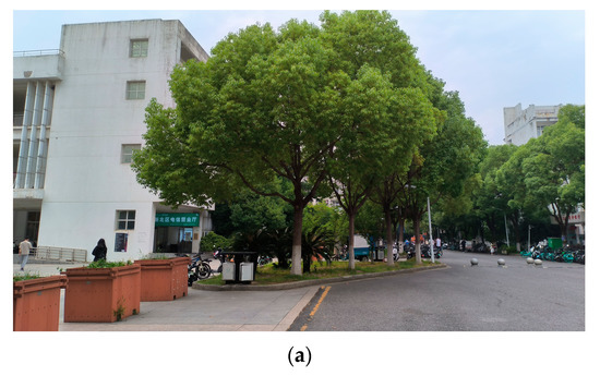 In Experiment 2, the selected outdoor environment provided a more complex setting to test the proposed SLAM system. The ground truth is shown in Figure 9a–c. The road and parking lot that circled the building created a challenging closed-loop path, requiring the system to handle dynamic changes in the environment, such as moving vehicles and pedestrians. The filtering-based mechanism of VINS-Fusion proved to have limitations in this kind of environment, as deviations from the reference path occurred after loop closure. In contrast, our system demonstrated improved robustness and accuracy in handling dynamic changes, including correcting for data distortion caused by large camera shakes through a virtual inertial navigation component.