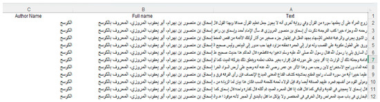 Although preprocessing is an important step that can impact model performance, according to [45,46], there is no need for deep preprocessing, such as removing the frequent usage of stop words and performing the stemming of words, particularly for the task of AA, as these aspects are considered integral to the authors’ writing styles. In this context, we have used a few basic regular expressions to remove all unused characters from the Arabic texts. We removed all numbers, English letters, newline delimiters, and special (non-alphanumeric) characters, and removed additional spaces between the words. Figure 1 provides some examples of the dataset.