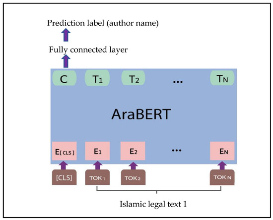 To summarize the review of the relevant work, AA is a well-established task in the natural language processing literature. However, compared to other languages, relatively few studies examine AA for Arabic, and fewer still investigate it for the genre of Islamic texts. Surveying the literature shows that 85% of Arabic AA research papers have used either statistical methods or traditional machine learning-based approaches [15,16,19,28]. The traditional machine learning classifiers such as SMO-SVM, linear regression, and MLP achieved a high level of accuracy, as in [6], which reached 100%. In contrast, the KNN machine learning classifier achieved a low level of accuracy of 35% in [19]. One study, [40], used a deep learning approach by using an artificial neural network for the task of Arabic AA. However, no existing studies have used transformer- or BERT-based models for Islamic legal text AA.