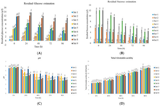 As shown in Figure 1A,B, the concentrations of residual glucose and sucrose were determined at regular time intervals during fermentation. A significant increase in glucose concentration (p < 0.05) was observed after 24 h for all experimental sets (Figure 1A). This could be due to the metabolism of sucrose by yeast, yielding glucose and fructose.