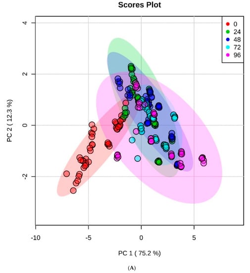 The PCA- 2D score plots (Figure 2A) distinguished the CWK sets after longer fermentation times (24 h to 96 h) that were associated with higher concentrations of carboxylic acids from the non-fermented sample (0 h). PC1 and PC2 accounted for 75.2% and 12.3% of the total variation, respectively. The scores for the different kefir fermented coconut water were clearly separated according to fermentation time (T = 0, 24, 48, 72 and 96 h) indicating distinct changes in acids during fermentation. Samples at time T = 0 had negative scores along PC1. With increasing fermentation time (T = 24, 48, 72, and 96 h), sample scores became increasingly positive.