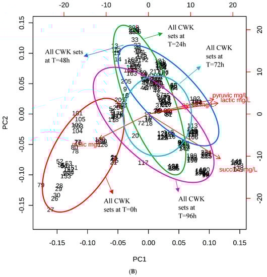 : T= 96 h. (B) Principal components analysis (PCA) biplot showing PC scores for the experimental sets fermented at different times (T = 0 in red, 24 in green, 48 in blue, 72 in cyan, and 96 h in purple) that are presented as numbers and loadings of carboxylic acids in the CWK sets. The product loadings (1–150) are representative of samples and replicates. PC1 and PC2 explained 75.2% and 12.3% variances in the data, respectively.