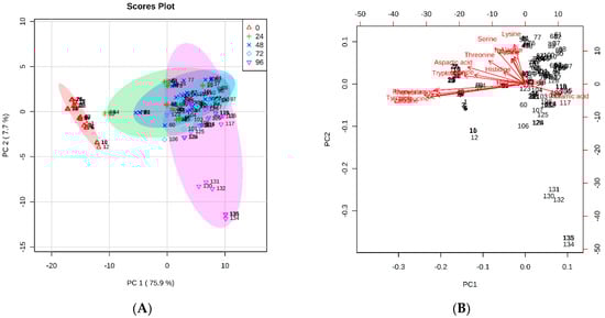 PCA plots as shown in figures (A, B). (A): The PCA 2D score plot derived for 18 amino acids present in kefir fermented coconut water sets at times, T = 0, 24, 48, 72, and 96 h. The score plot shows a clear differentiation between samples with fermentation time. (B): PCA biplot of amino acids for all the kefir coconut water sets fermented for 0, 24, 48, 72, and 96 h. The correlation loadings refer to the amino acids present in the samples. PC1 and PC2 explained 75.2% and 12.3% variances in the data, respectively. Experimental sets numbered refer to different experimental sets: Numbers 1–15: refer to Set 1, numbers 16–30: refer to Set 2, numbers 31–45: refer to Set 3, numbers 46–60: refer to Set 4, numbers 61–75: refer to Set 5, numbers 76–90: refer to Set 6, numbers 91–105: refer to Set 7, numbers 106–120: refer to Set 8, and numbers 121–135: refer to Set 9.