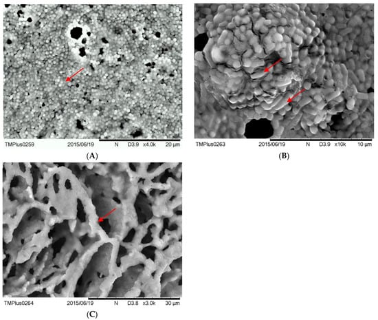 The scanning electron micrographs of CWK grains. (A): The surface appearance of CWK microflora (magnification of up to ×4000. The red arrow indicates the presence of coccus-shaped lactic acid bacteria, as shown in (B): The surface appearance of the cross-section of the CWK microflora (magnification of up to ×10,000). The red arrows indicate the presence of rod-shaped lactic acid bacteria; (C): SEM of kefir network, in CWK, on the polysaccharide scaffold (magnification of up to ×3000). The red arrow indicates a polysaccharide matrix with symbiotic yeast and lactic acid bacteria (kefiran complex).