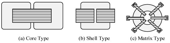In all the topologies depicted in Figure 1, power bidirectionality can be ensured by using power semiconductors that support operation in all four quadrants. The topology of the transformer is as important as the components in meeting the requirements of power density and efficiency. As SST applications, we highlight the solenoidal structures, namely the core type, shell type, and matrix type in Figure 2 [,].