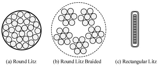 Of the mechanisms developed so far, the most efficient for reduction is the Litz wire. This consists of a set of single conductors isolated from each other, which can also be braided together in a uniform pattern, as illustrated in Figure 3 [].