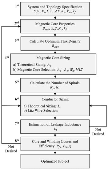 This paper proposes a step-by-step methodology for designing medium and high-frequency transformers and their optimum electrical and magnetic specifications to reduce volume and increase efficiency. The proposed design methodology for the HFT first finds the optimum magnetic- flux density and then arrives at the other parameters according to the desired criteria such as leakage inductance and losses, as shown in Figure 4.