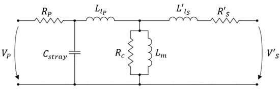 Figure 6 shows the simplified equivalent scheme of an HFT, referenced to the transformer’s primary []. With the transition of a parameter from the secondary to the primary, as a rule, the same nomenclature is maintained, but a pellicle is added.